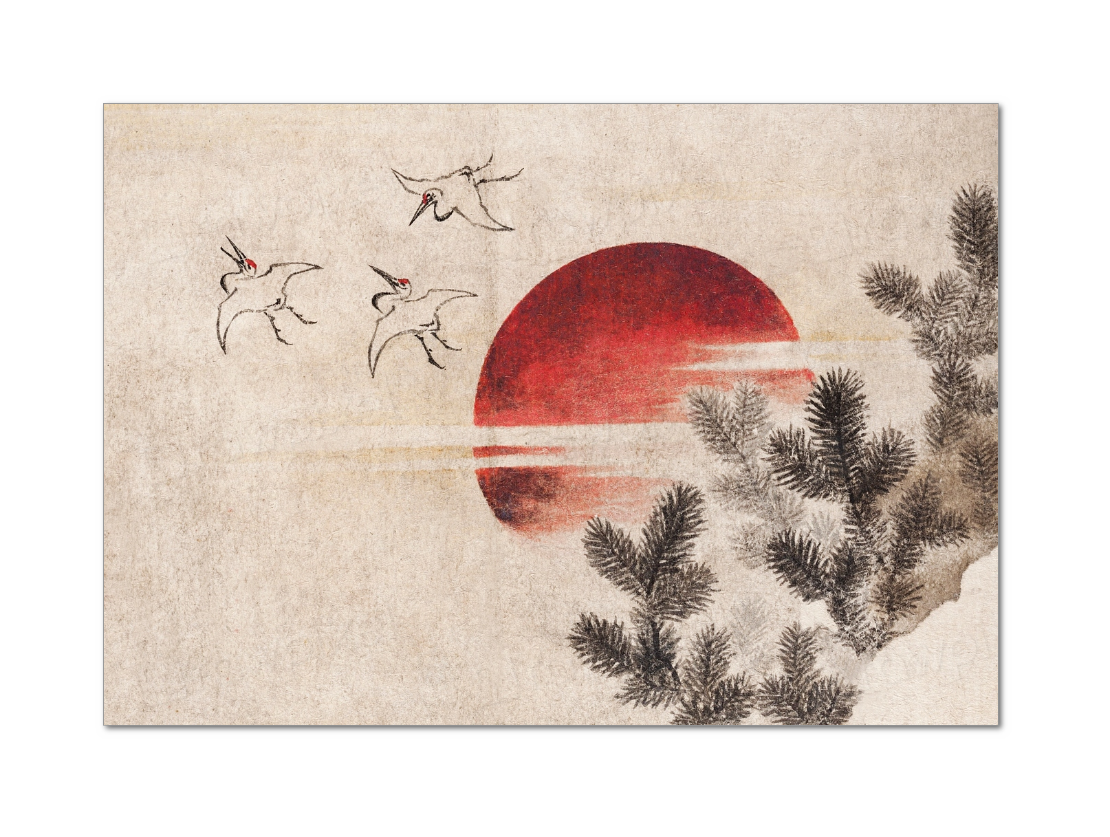 Print of Katsushika Hokusai’s birds and sunset.