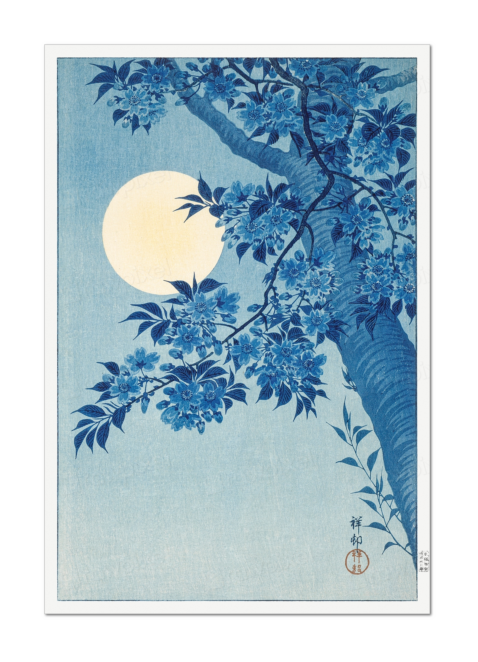 Print of Blossoming Cherry on a Moonlit Night by Ohara Koson.