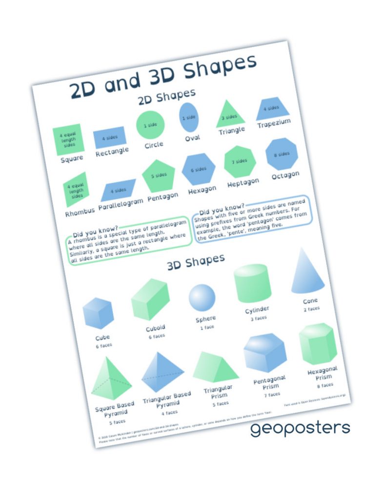 This poster shows the names of a variety of 2D & 3D shapes, along with the number of sides or faces they have. This is an ideal resource for the classroom or home to encourage children to begin exploring shapes and naming them along with the number of sides/faces. This also helps children learn to differentiate 2D and 3D shapes. This product is primarily aimed at younger children learning the basics, and does not include more complicated aspects such as angles and vertices.