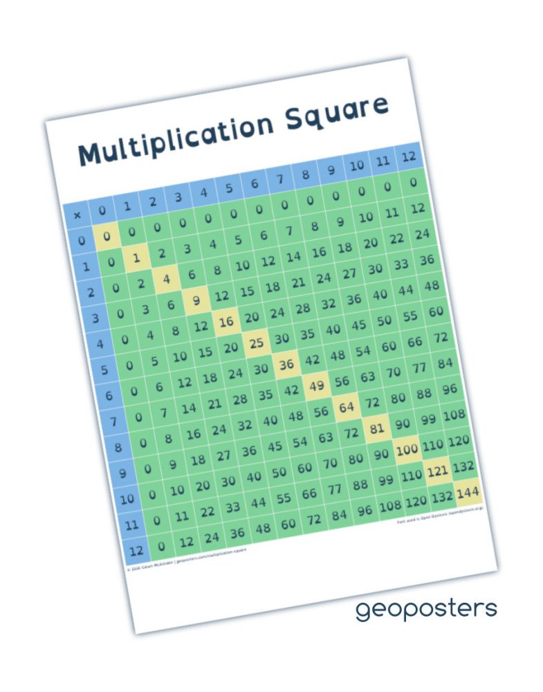This poster can be used as a reference to help learn times tables up to 12×12. By choosing two numbers to multiply along the top and the left of the grid, the result can be found where the row and column meet. Square numbers are shown in yellow, and there are many more patterns to be discovered!