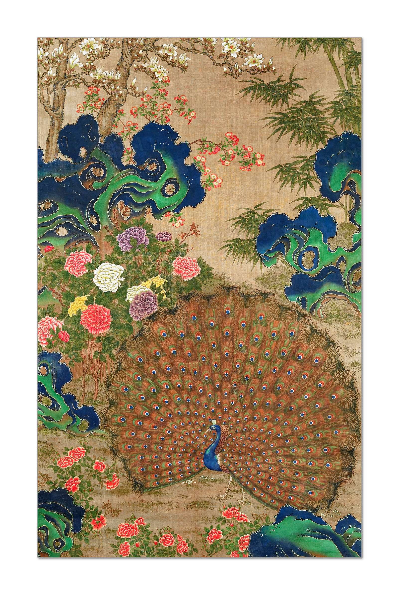 Print of a 17th-century Chinese painting of a peacock and flowers. Artist unknown.