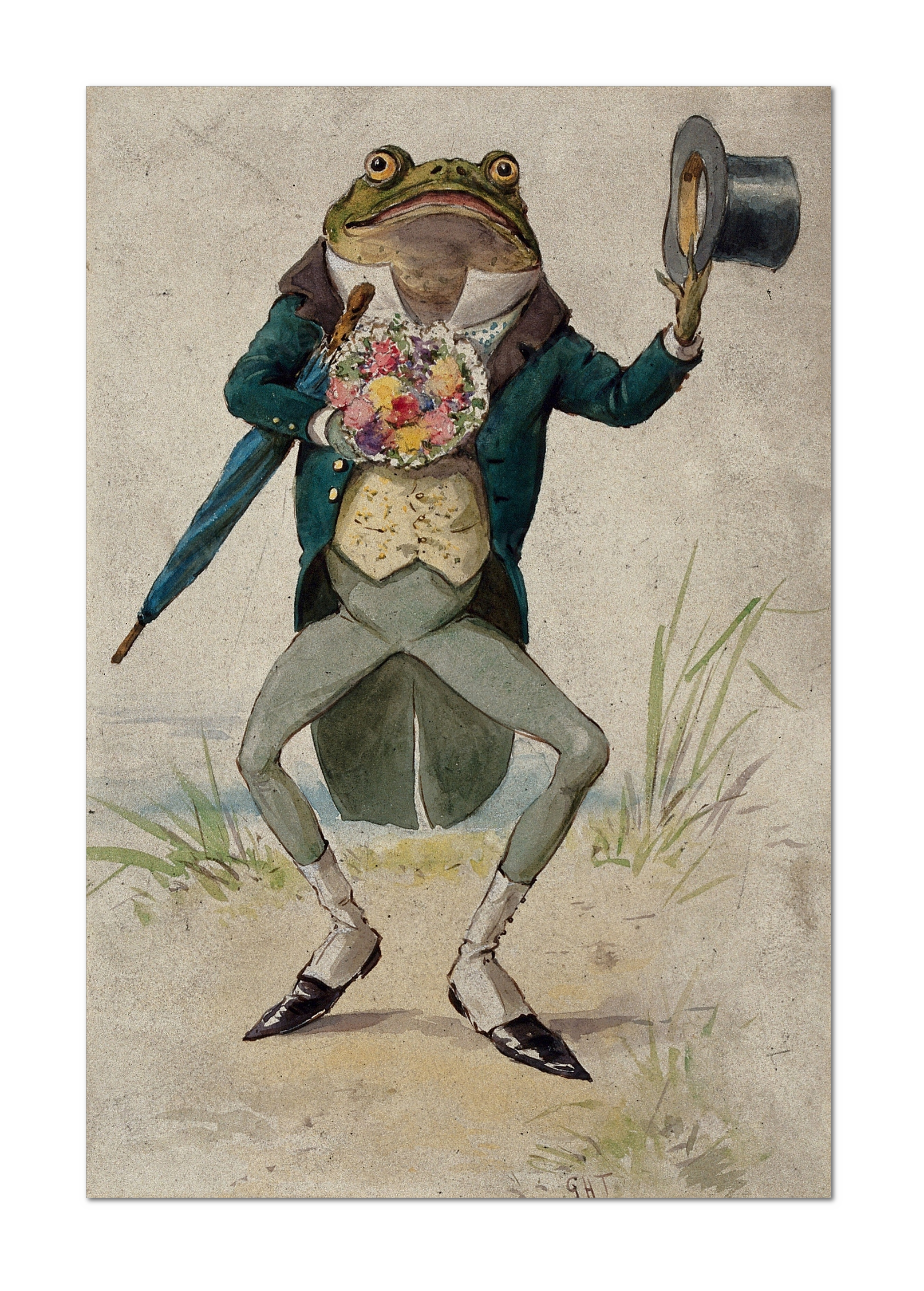 Print of a watercolour painting by G. Hope Tait, circa 1900, depicting a toad in clothing holding an umbrella and flowers.